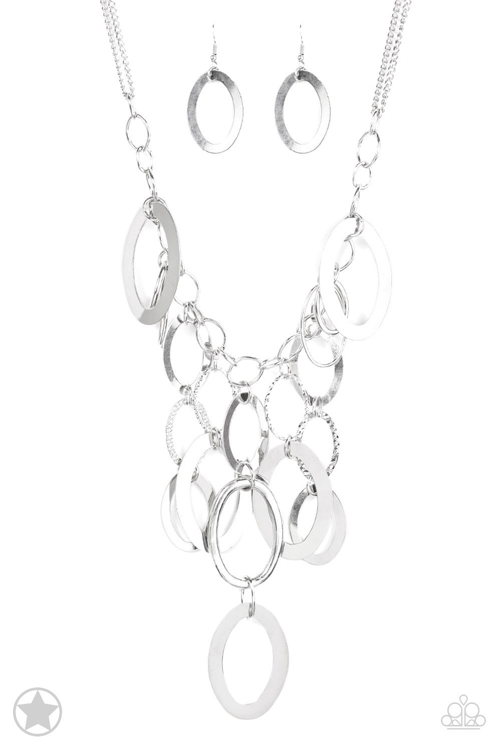 Large silver links and shimmering textured silver rings cascade below a silver chain freely, allowing for movement that makes a bold statement. Features an adjustable clasp closure.