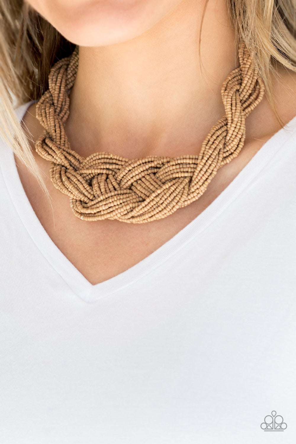 Countless strands of brown seed beads are twisted and knotted together to create an unforgettable statement piece. Features an adjustable clasp closure.
