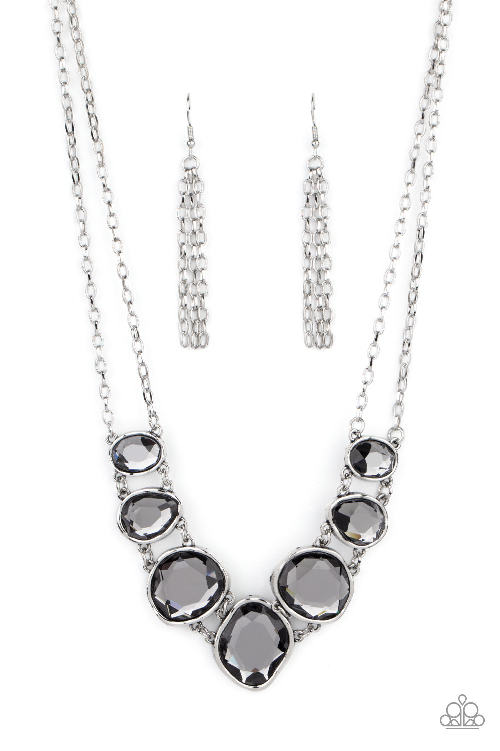 Encased in hammered asymmetrical silver frames, an imperfect collection of faceted smoky gems are suspended from two shimmery silver chains as they double-link below the collar for a dramatic effect. Features an adjustable clasp closure.