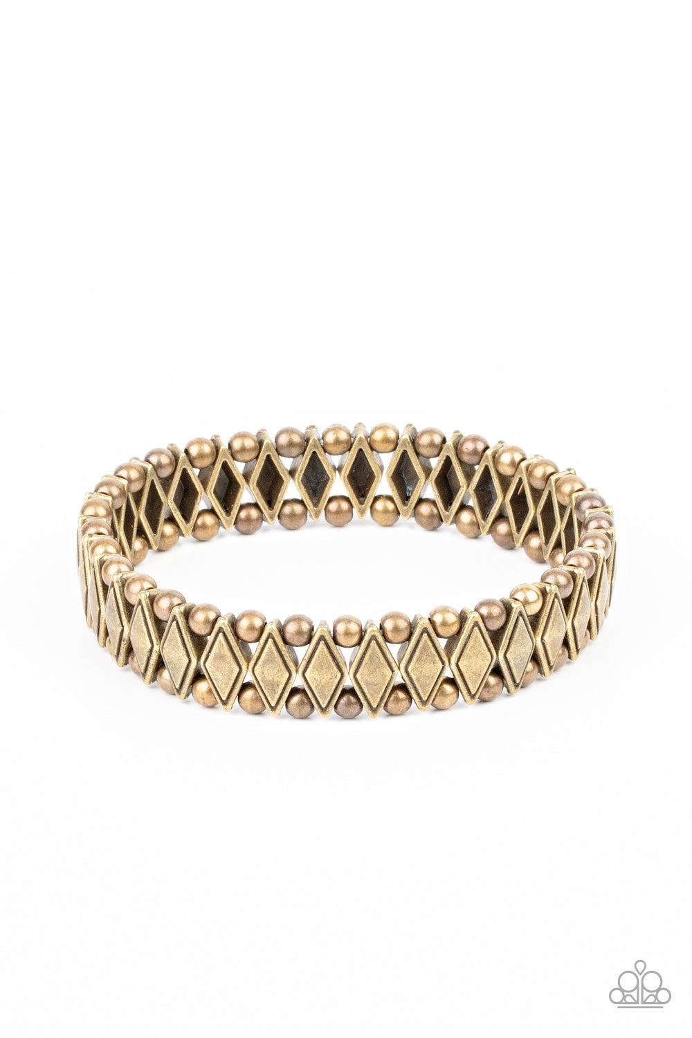 Brushed in an antiqued shimmer, pairs of dainty brass beads flank diamond shaped brass beads along stretchy bands around the wrist for a rustic fashion.