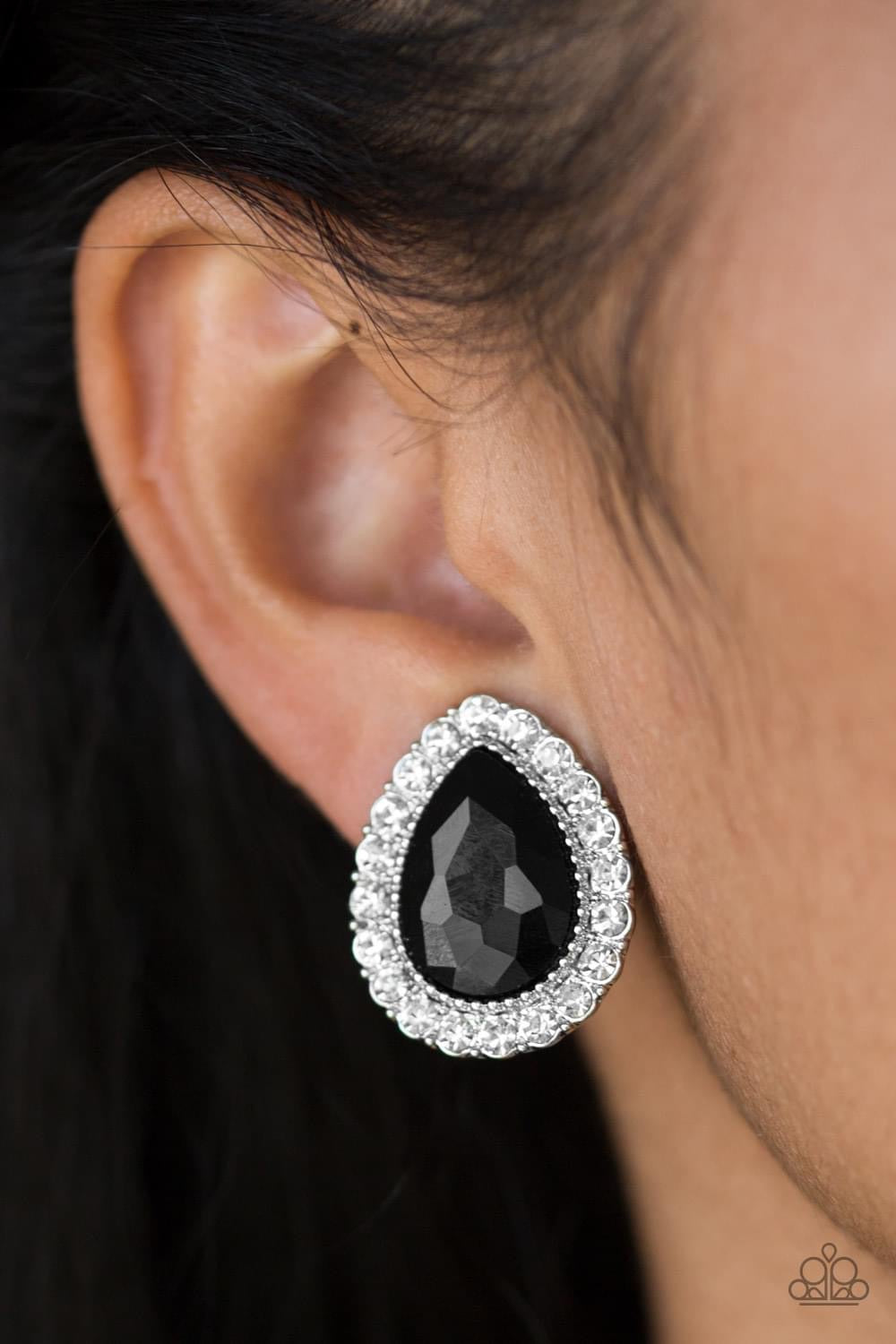 Glassy white rhinestones spin around a faceted black teardrop gem for a regal look. Earring attaches to a standard clip-on fitting.