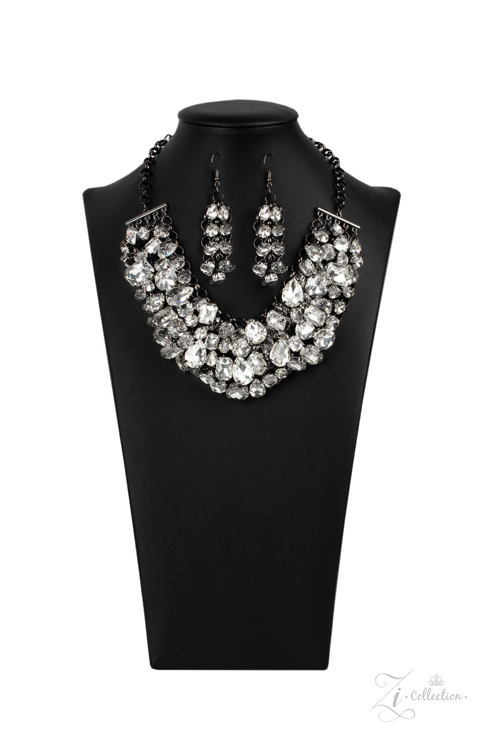 A modern mashup of round, teardrop, and emerald cut white rhinestones link into jam-packed rows of jaw-dropping radiance. Attached to an interconnected gunmetal mesh backdrop, the clustered fringe fabulously drapes below the collar in a spellbinding fashion. Features an adjustable clasp closure.