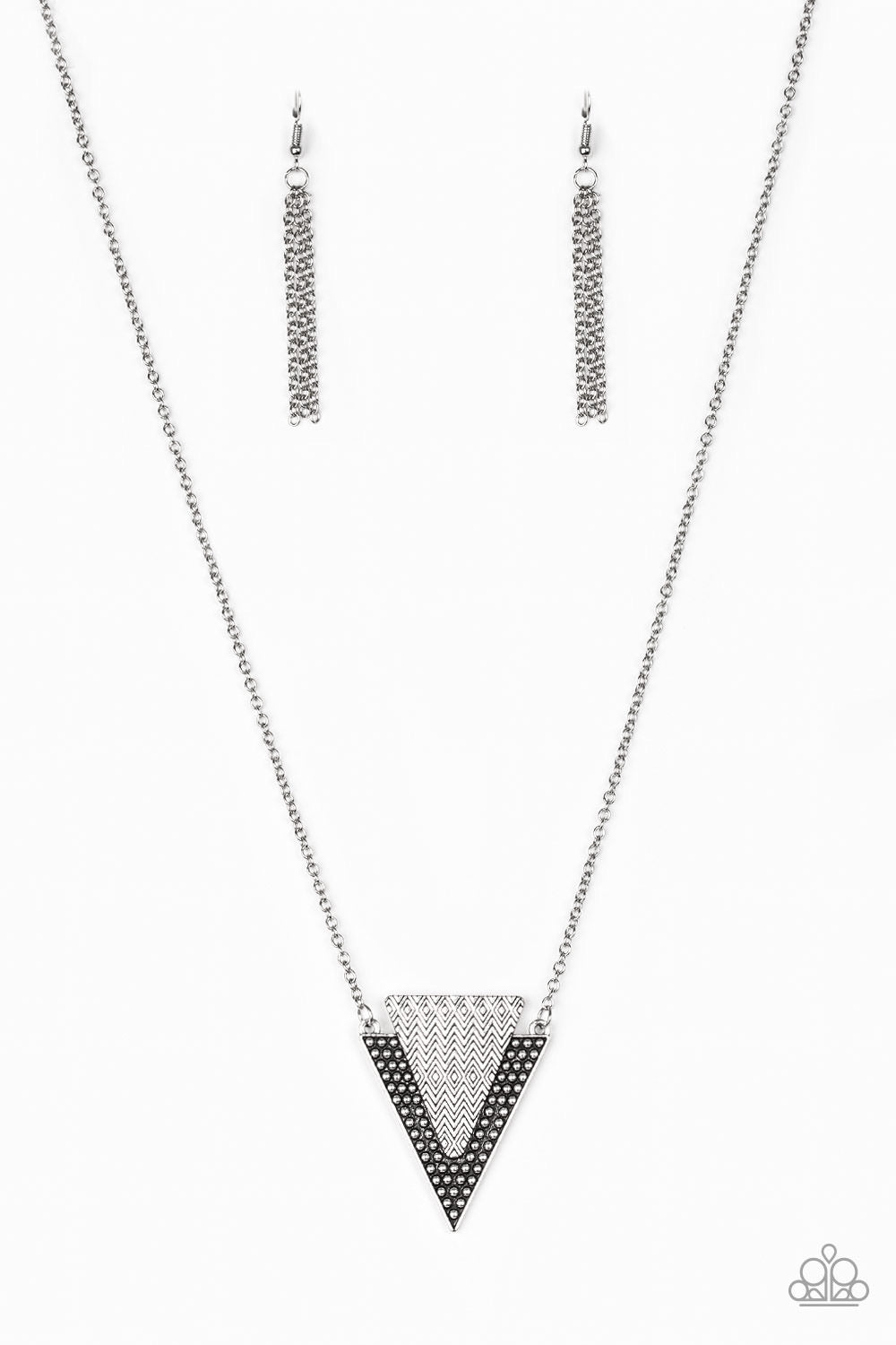 Stamped and studded in indigenous inspired textures, a stacked triangular pendant swings from the bottom of an elongated silver chain for a trendy tribal look. Features an adjustable clasp closure.