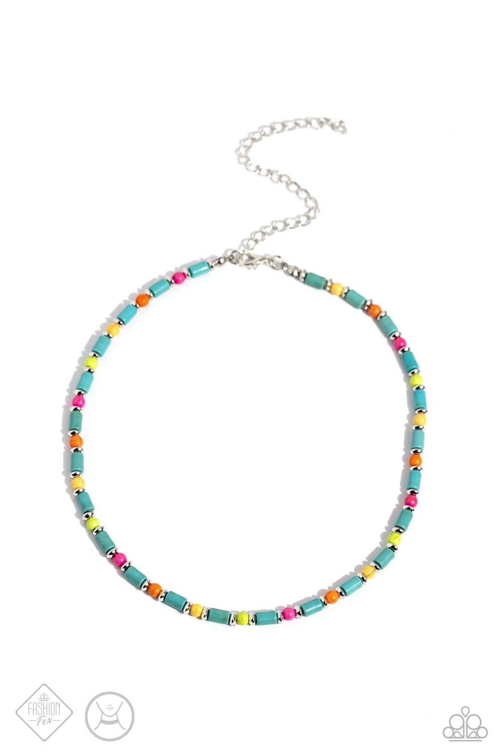 Infused on an invisible wire, cylindrical turquoise beads, silver discs, and circular multicolored stones coalesce around the collar for a colorfully earthy layer. Features an adjustable clasp closure. As the stone elements in this piece are natural, some color variation is normal.