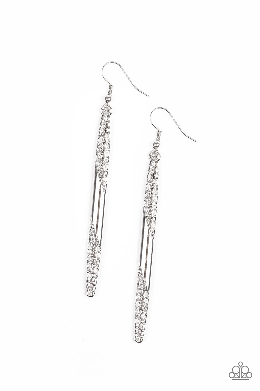 Wrapped in ribbons of shimmer, sections of a glistening silver pendulum is encrusted in glassy white rhinestones for a refined look. Earring attaches to a standard fishhook fitting.