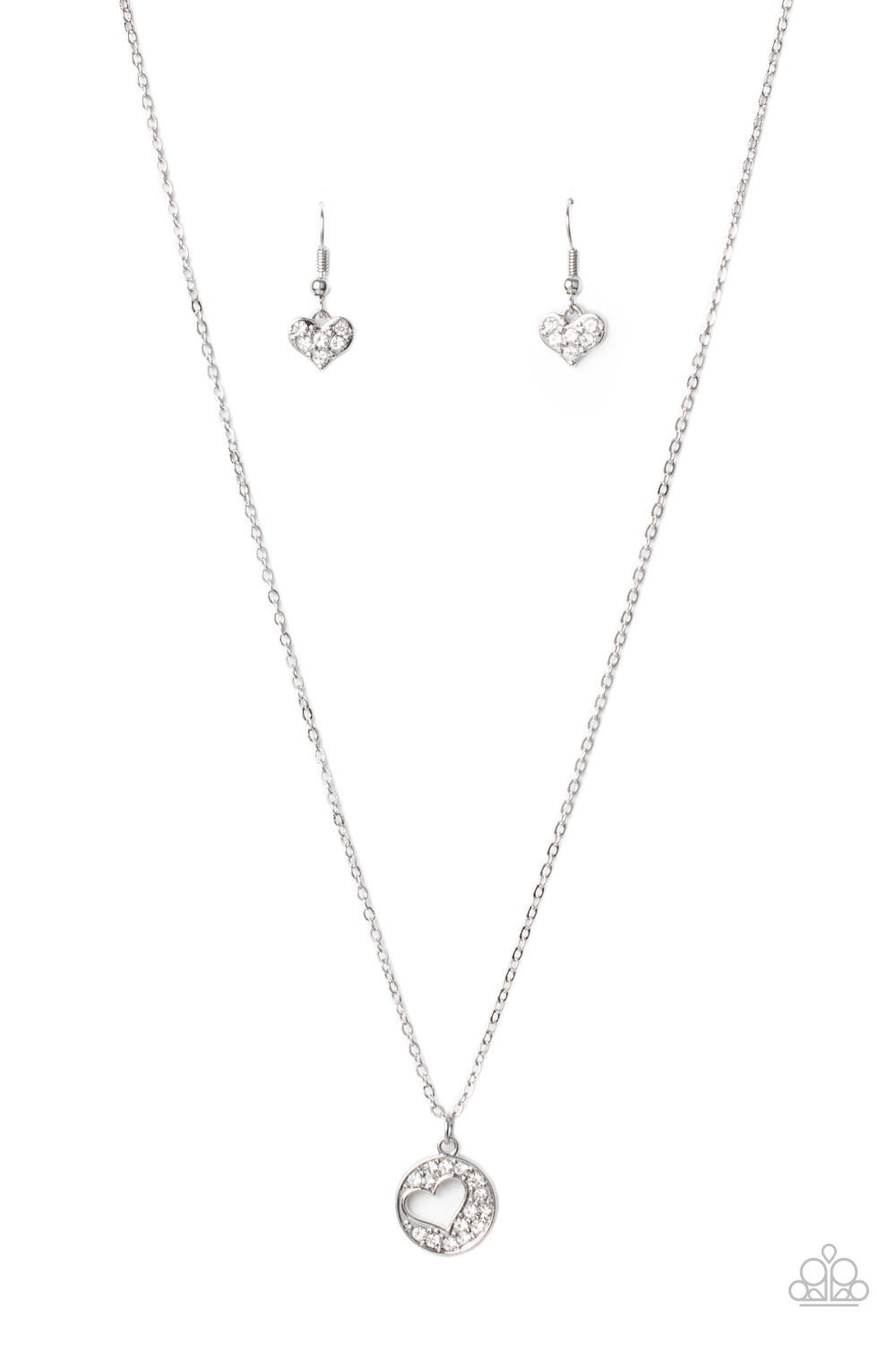 Featuring an airy heart cutout, a glittery white rhinestone encrusted silver disc swings from the bottom of a dainty silver chain below the collar for a romantic flair. Features an adjustable clasp closure.