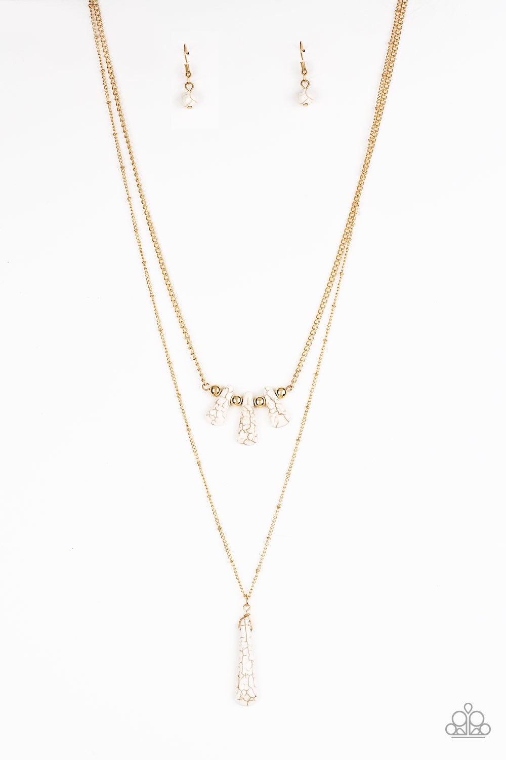 Chiseled into flared teardrop shapes, a dainty fringe of white stones and golden beads gives way to a large stone pendant, creating earthy layers down the chest. Features an adjustable clasp closure.