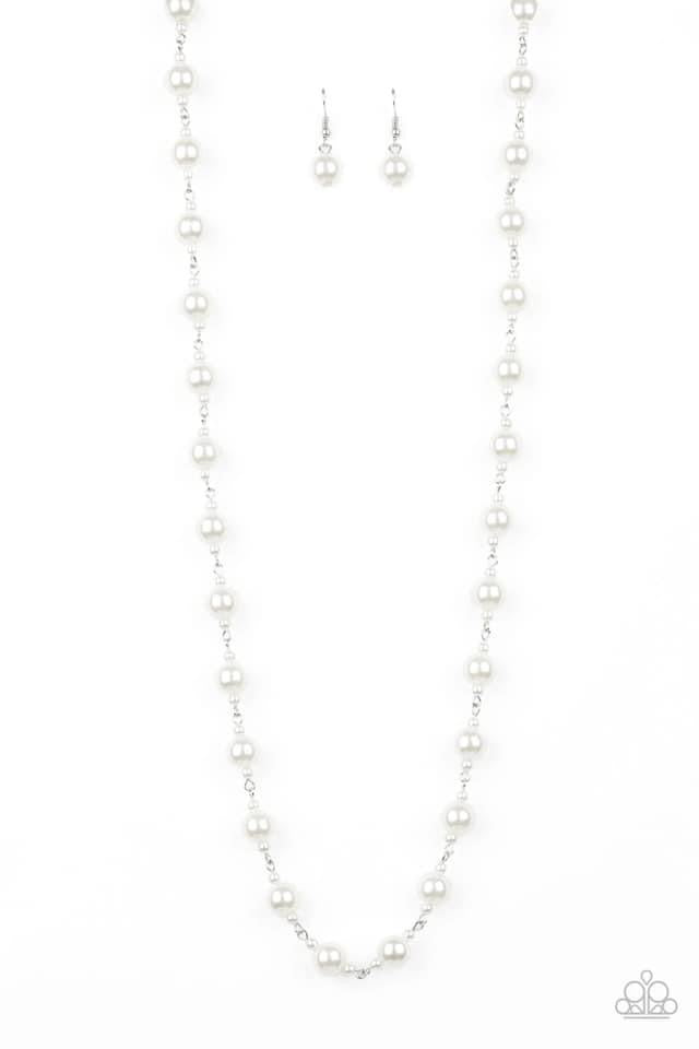 A collection of dainty and classic white pearls link across the chest in a timeless fashion. Features an adjustable clasp closure.