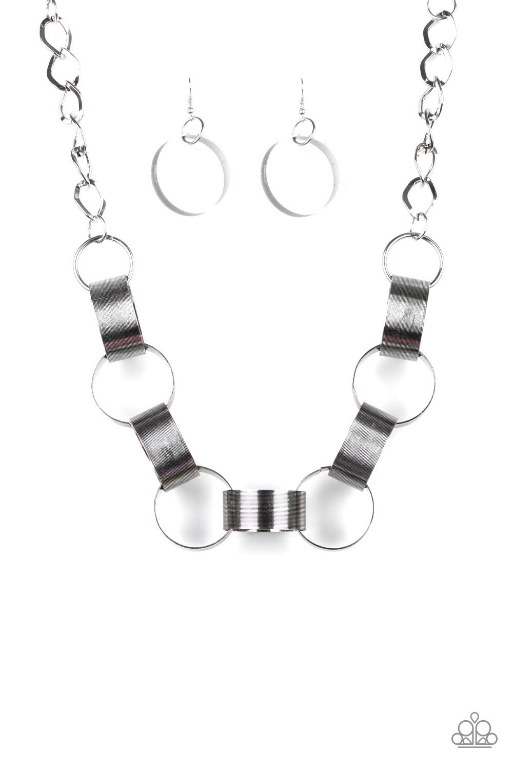 Etched in linear patterns, dramatically oversized silver links connect below the collar for a bold statement-making look. Features an adjustable clasp closure.