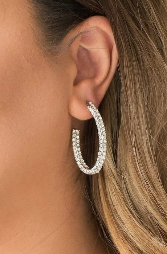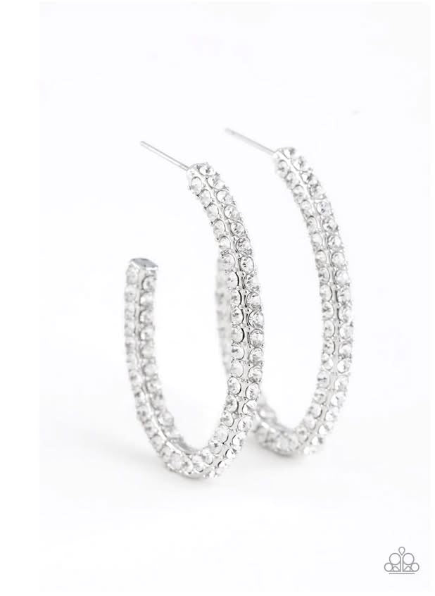 Glassy white rhinestones are encrusted along three sides of an abstract silver hoop for a glamorous look. Earring attaches to a standard post fitting. Hoop measures 1" in diameter.
