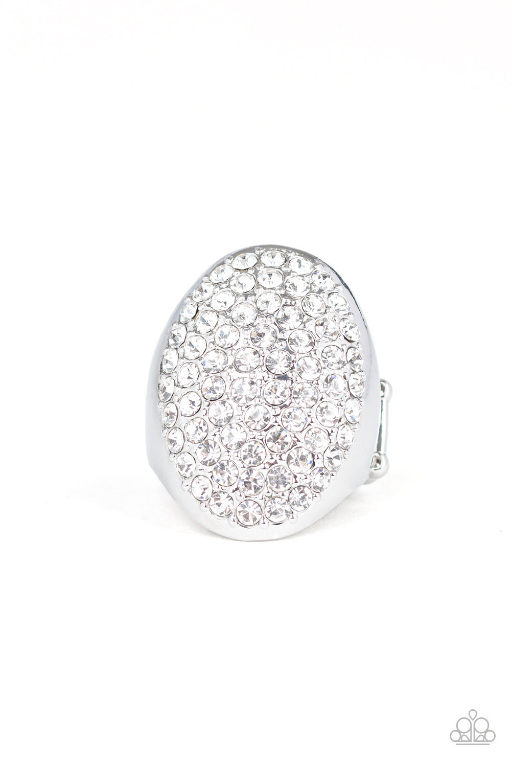 Row after row of dazzling white rhinestones radiate out from the center of a thick silver frame, creating a blinding centerpiece atop the finger. Features a stretchy band for a flexible fit.