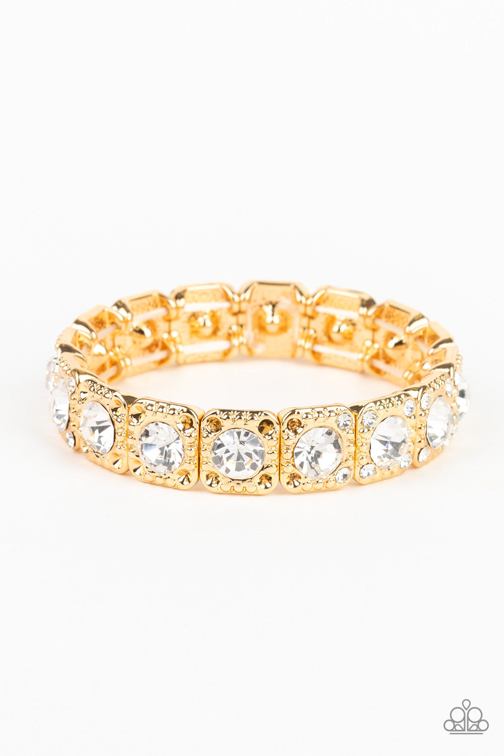 Featuring oversized white rhinestone centers, studded gold frames radiating in glassy white rhinestones are threaded along a stretchy band around the wrist for a glamorous fashion.