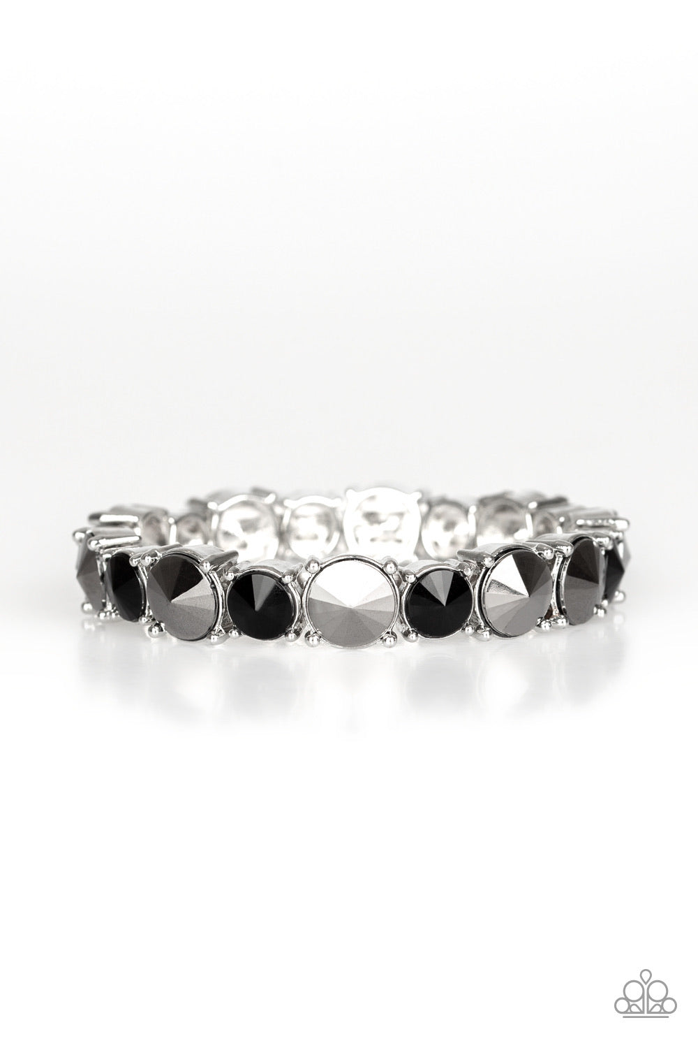 An assortment of oversized black and hematite rhinestones are pressed into sleek square frames and threaded along stretchy bands, creating a blinding sparkle around the wrist.
