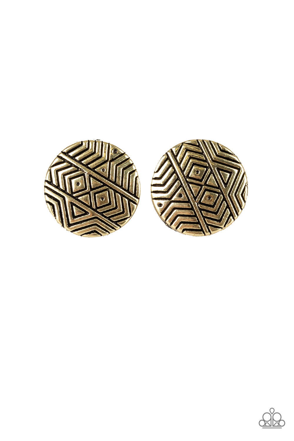 Stamped in tribal inspired textures, a round brass frame is brushed in an antiqued shimmer for a seasonal look. Earring attaches to a standard post fitting.