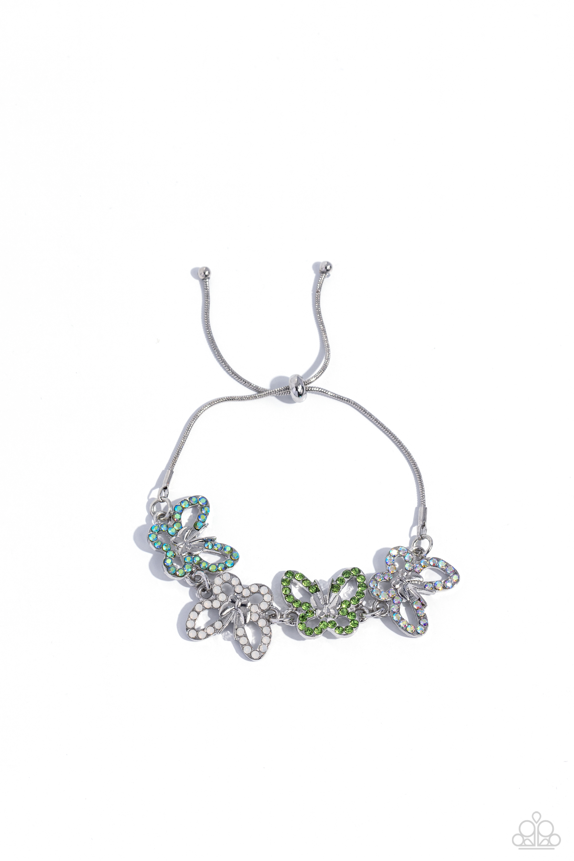 Attached to a silver snake chain, a whimsical collection of multicolored green, opalescent, and iridescent-dotted silver butterflies flutter along the wrist. Features a sliding bead closure. Due to its prismatic palette, color may vary.