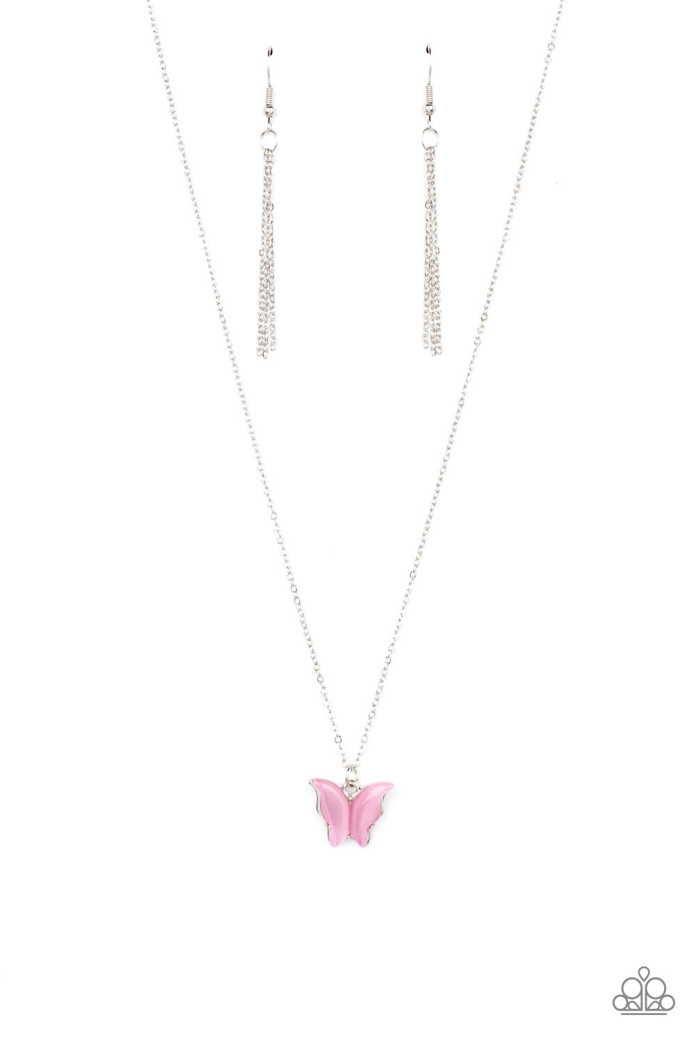 Infused with glistening pink cat's eye stone wings, a shiny silver butterfly pendant swings from a dainty silver chain below the collar for a whimsy flair. Features an adjustable clasp closure.