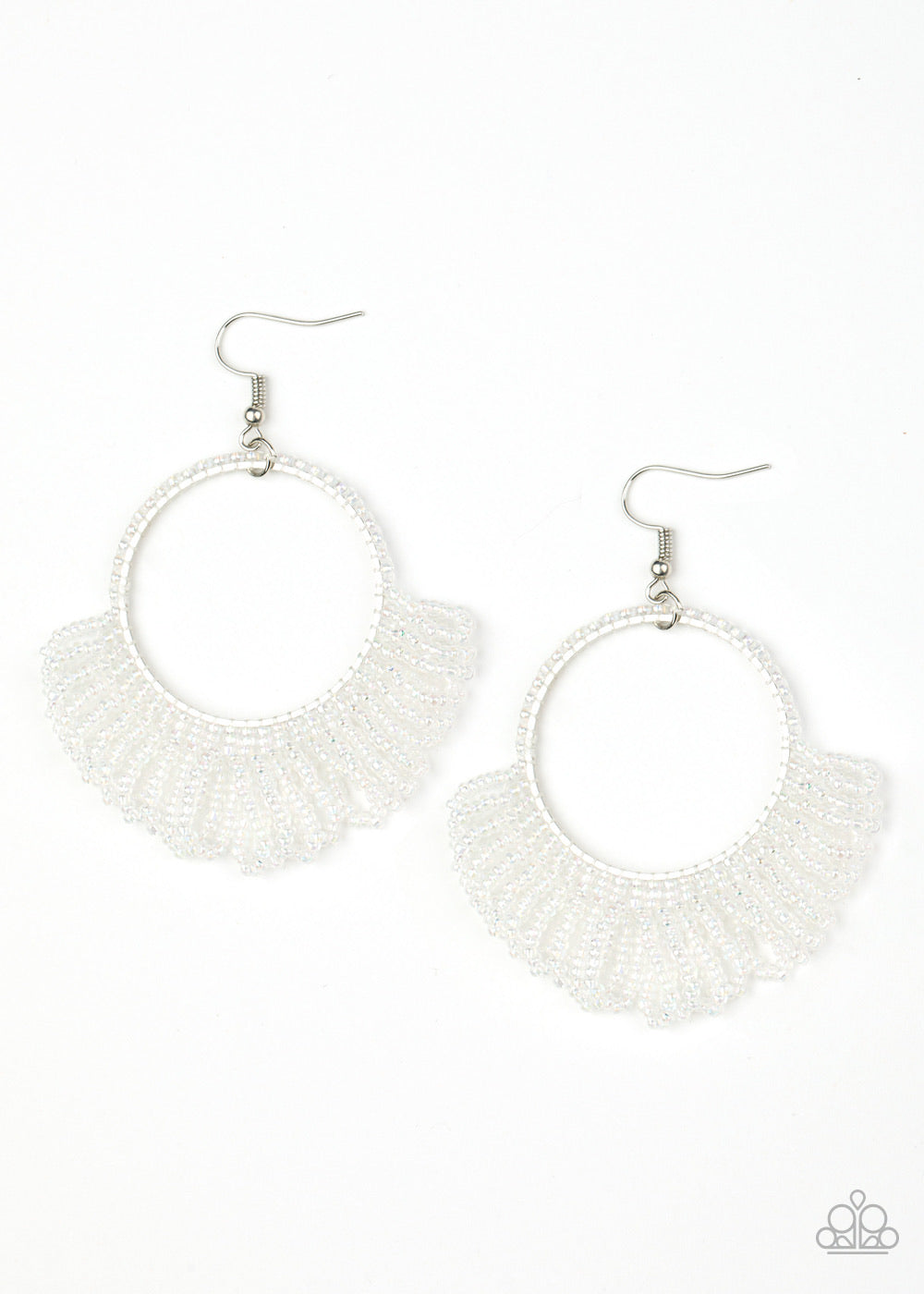 Rings of dainty iridescent seed beads cascade from the bottom of a matching beaded hoop, creating a dramatically colorful fringe. Earring attaches to a standard fishhook fitting.