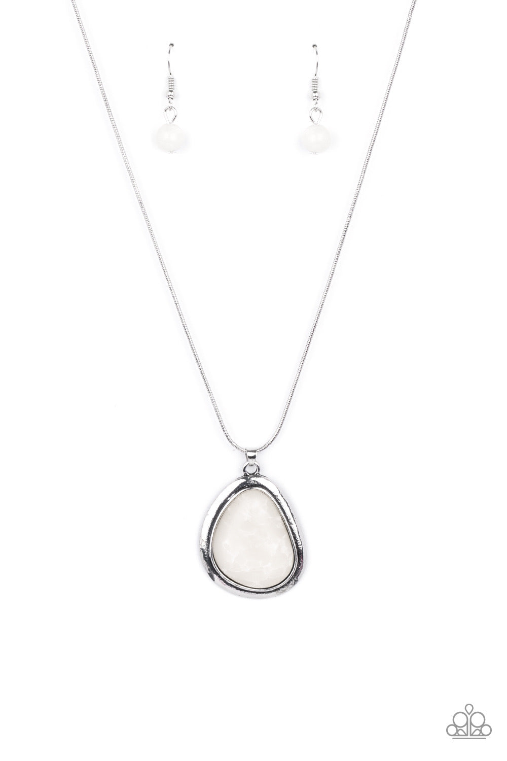 A marbled white stone is encased in a simple asymmetrical silver teardrop frame. The earthy pendant falls below the collar creating a natural and enduring impact. Features an adjustable clasp closure.