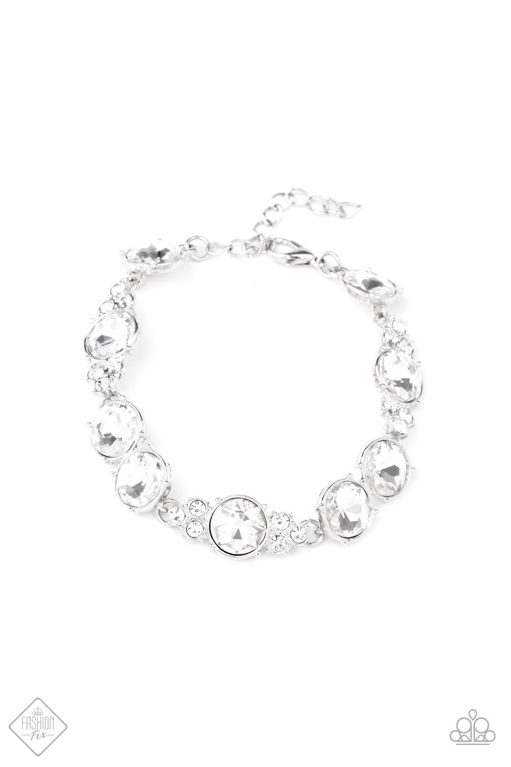 Pairs of stacked white rhinestone frames alternate with solitaire white rhinestones crowned in dainty white rhinestones along the wrist, creating a glamorous look. Features an adjustable clasp closure.