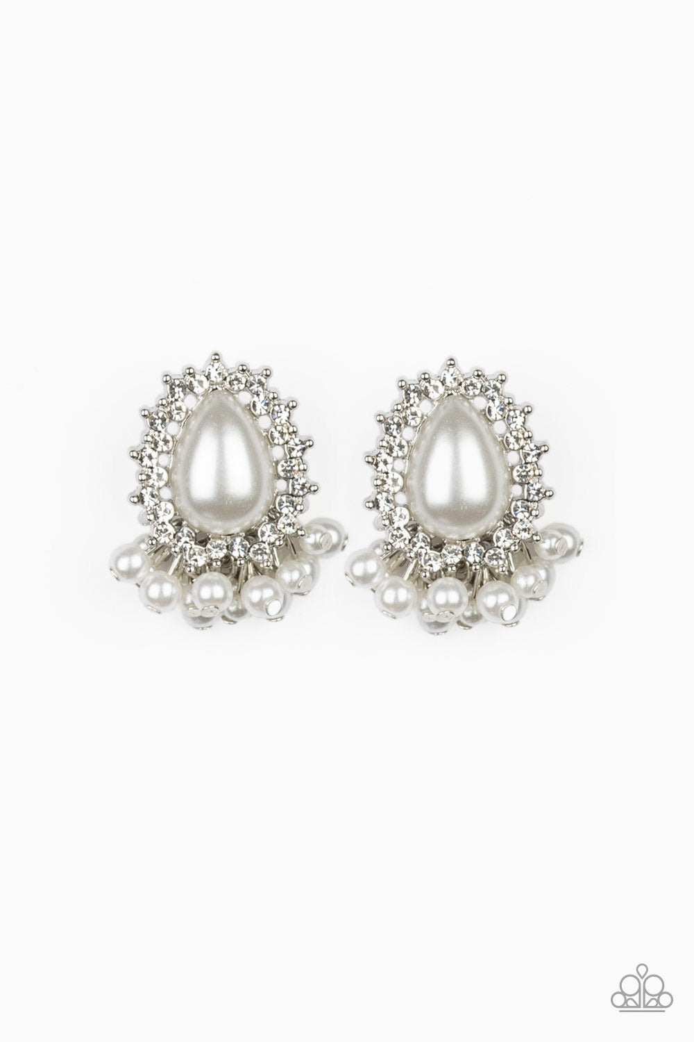 A pearly fringe swings from the bottom of a white rhinestone encrusted pearly beaded teardrop for a refined flair. Earring attaches to a standard post fitting.