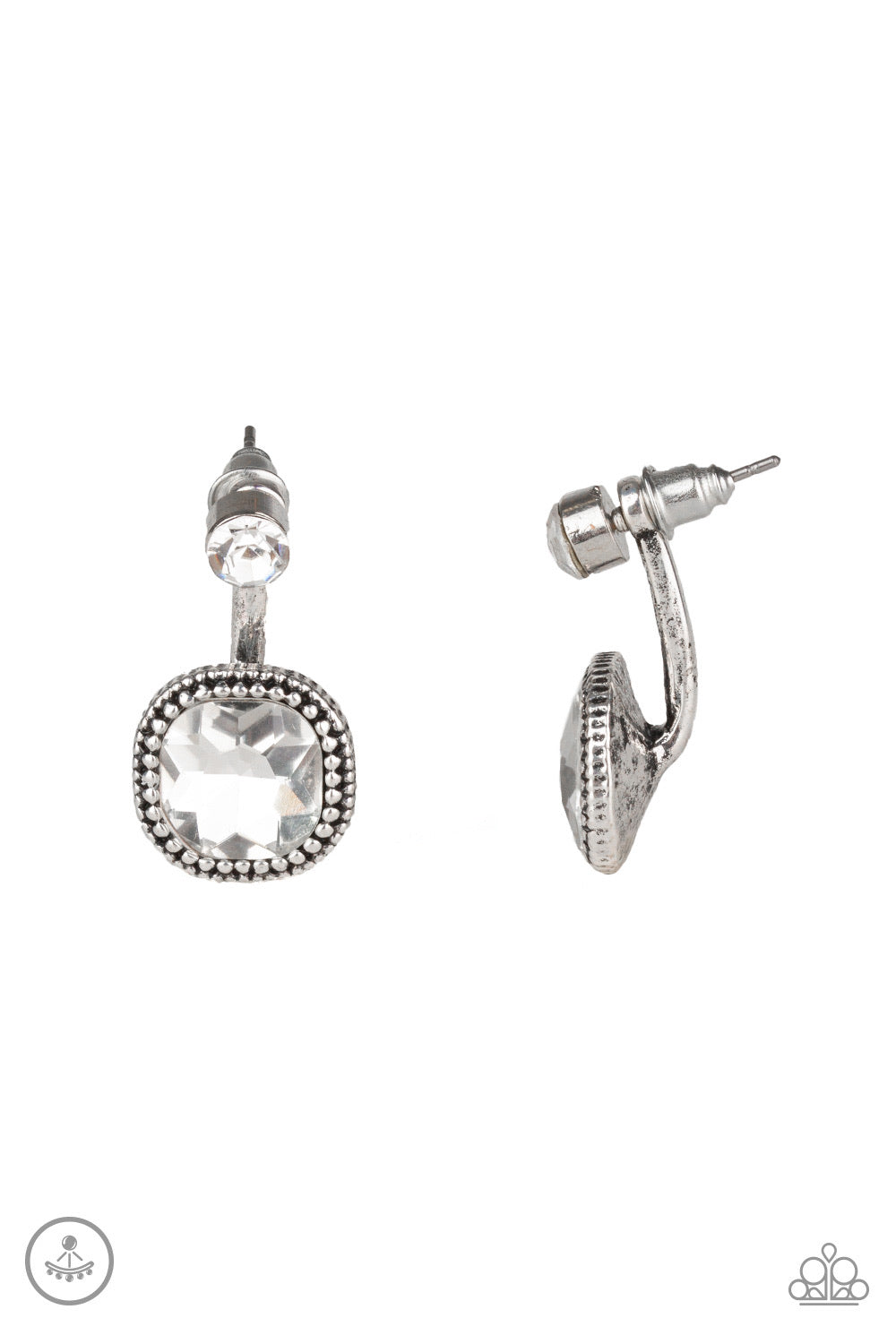 A solitaire white rhinestone attaches to a double-sided post, designed to fasten behind the ear. Featuring a faceted white gem, the glitzy double-sided post peeks out beneath the ear for a refined look. Earring attaches to a standard post fitting.