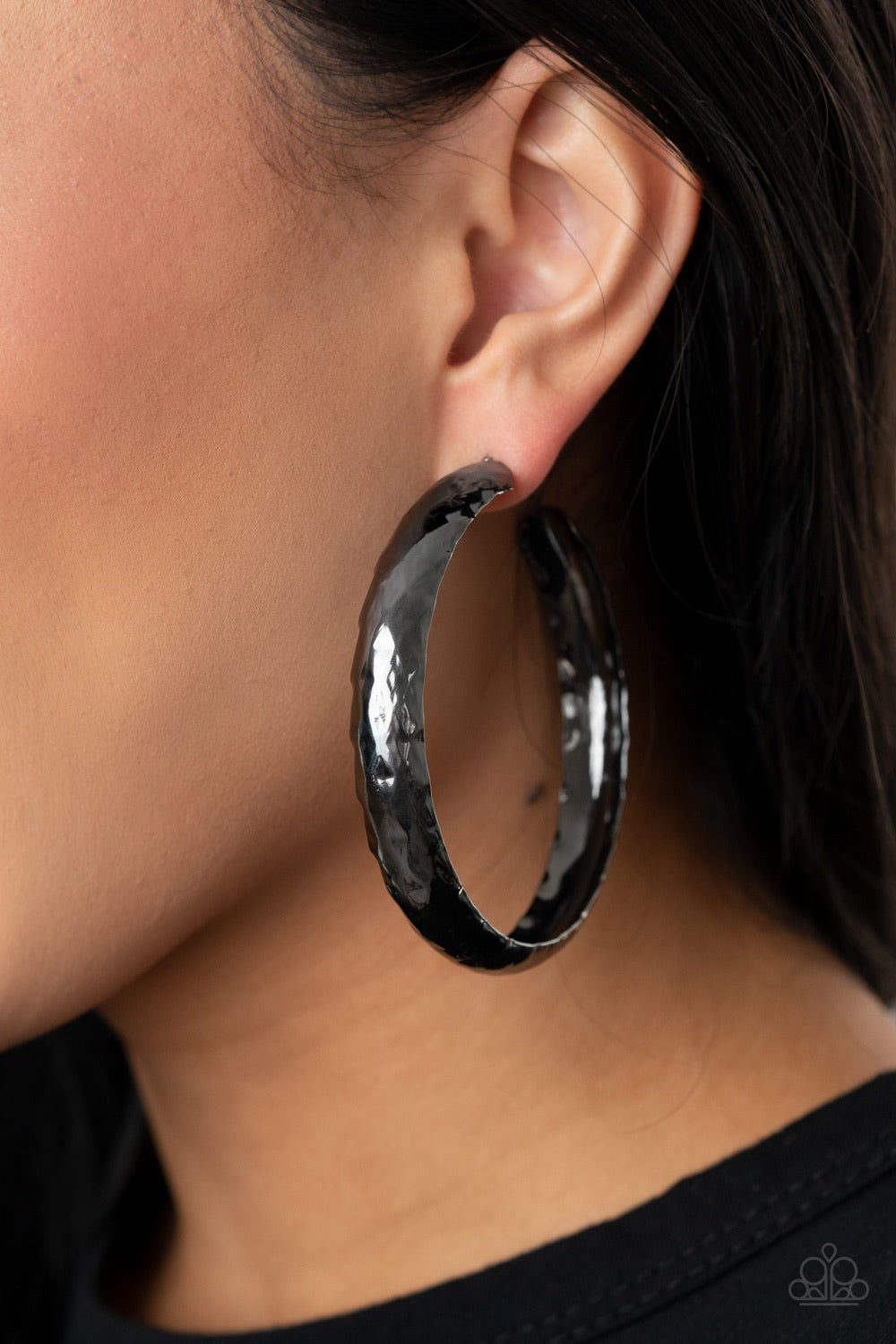 A thick piece of gunmetal has been heavily hammered and delicately curved into a dramatically handcrafted hoop. Earring attaches to a standard post fitting. Hoop measures approximately 2 ½” in diameter.