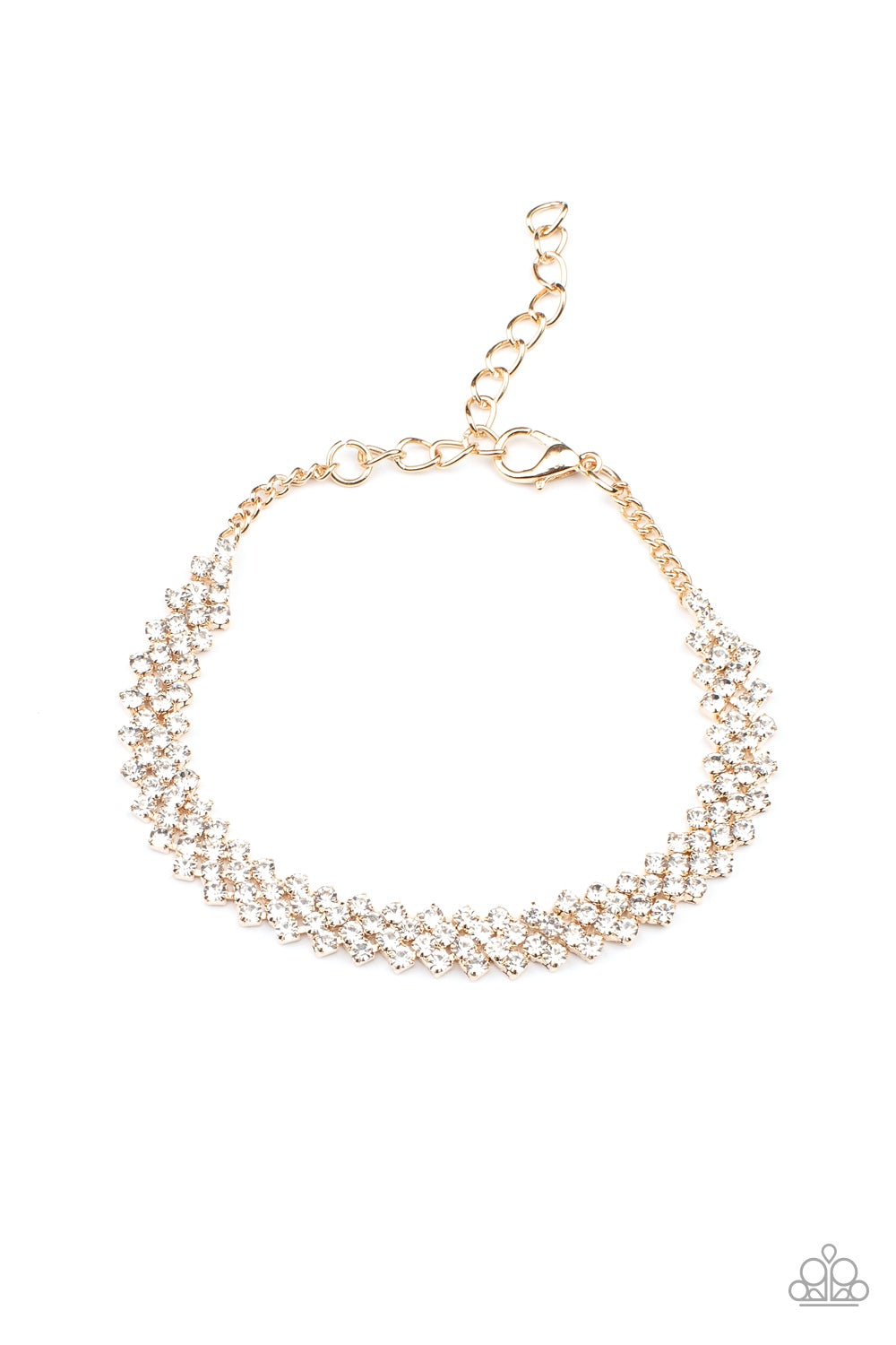 Featuring sleek gold fittings, dainty rows of glassy white rhinestones delicately slant across the wrist, coalescing into a timeless centerpiece. Features an adjustable clasp closure.