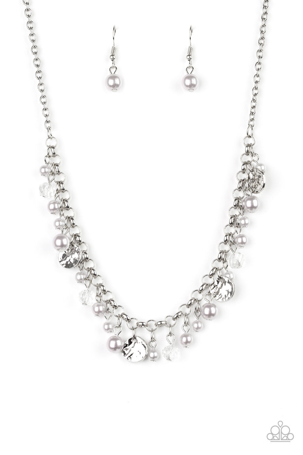 Pearly silver beads, smoky crystal-like gems, and hammered silver discs swing from a bold silver chain, creating a refined fringe below the collar. Features an adjustable clasp closure.