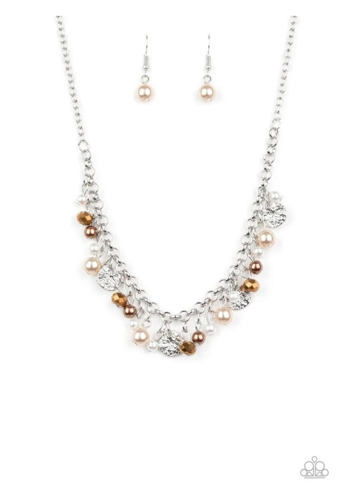Pearly white and brown beads, aurum crystal-like gems, and hammered silver discs swing from a bold silver chain, creating a refined fringe below the collar. Features an adjustable clasp closure.