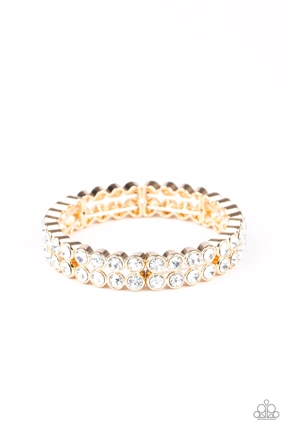 Pairs of glittery white rhinestones stack into sections of blinding frames that have been threaded along a stretchy band around the wrist for a glamorous look.