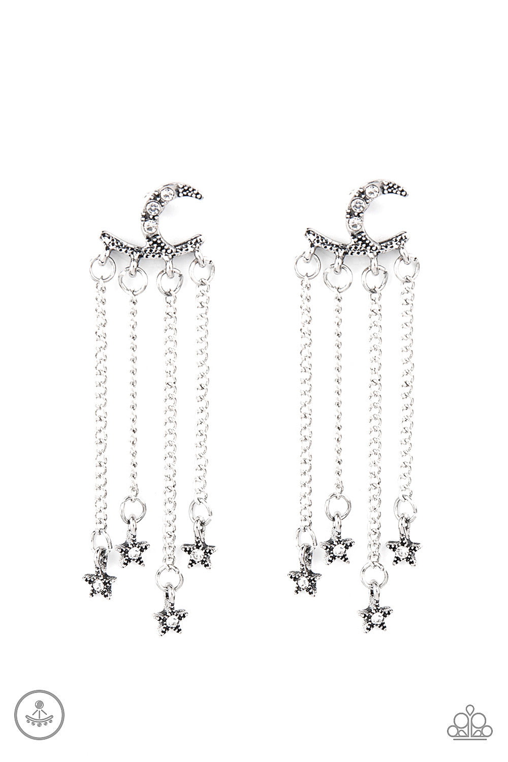 Encrusted in dainty white rhinestones, a studded silver moon fitting attaches to a double-sided post designed to fasten behind the ear. Dotted in dainty white rhinestones, dainty silver stars swing from a curtain of dainty silver chains peeking out behind the ear for an eye-catching finish. Earring attaches to a standard post fitting.