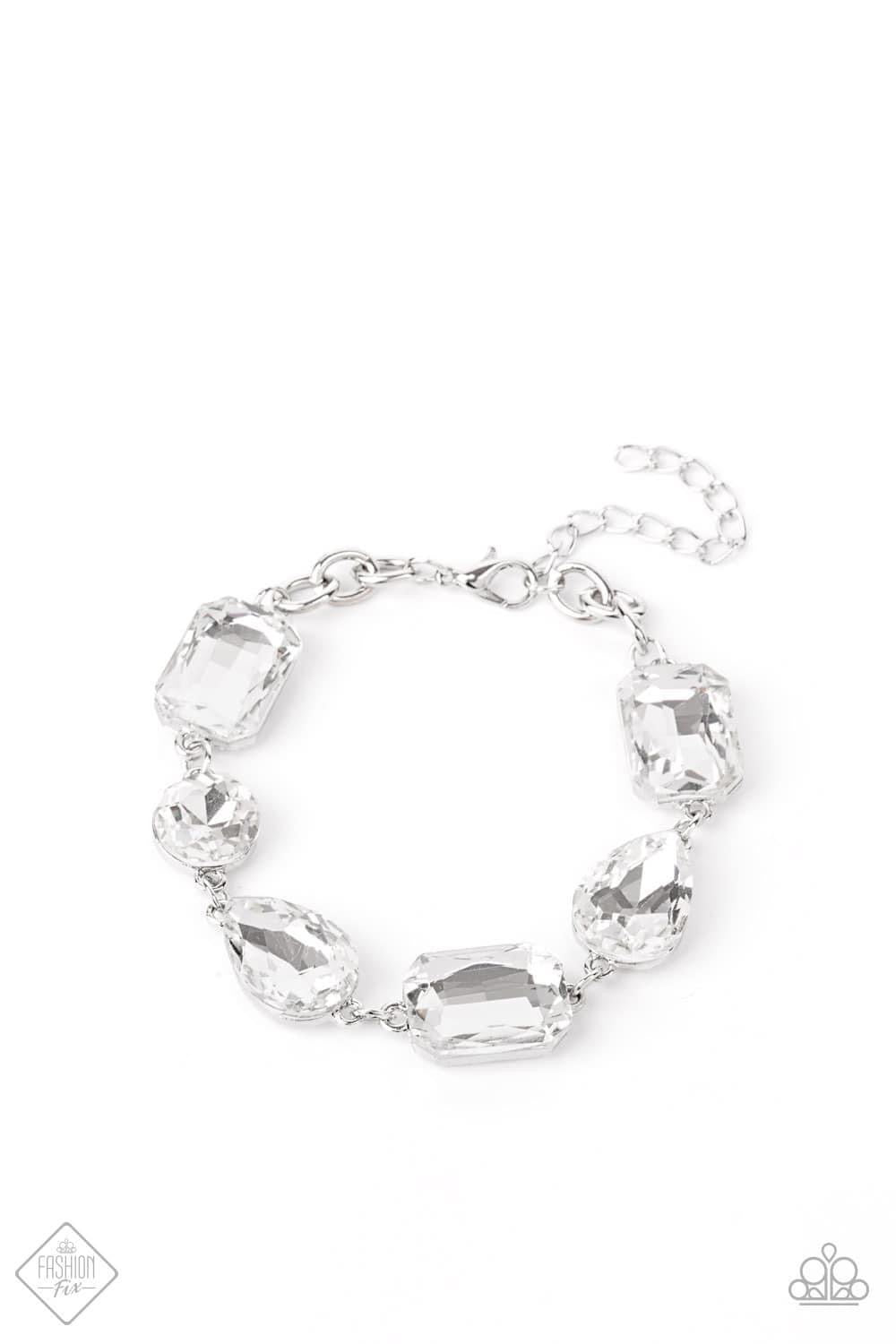 A collection of oversized round, teardrop, and emerald cut rhinestones delicately link around the wrist, creating a blinding statement piece. Features an adjustable clasp closure.