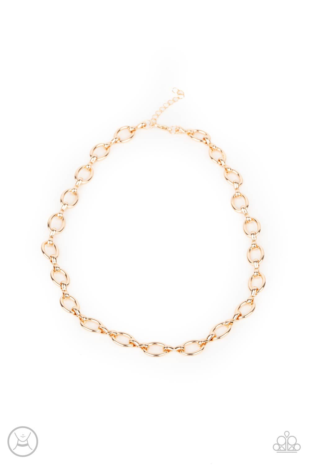 A collection of oversized gold ovals and glistening gold fittings interlock around the neck, creating an intense industrial look. Features an adjustable clasp closure.