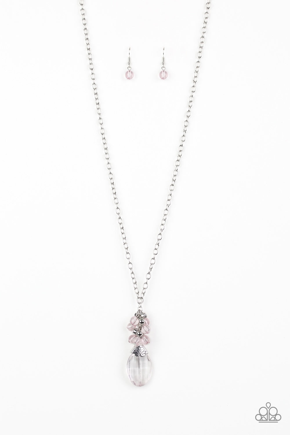 A collection of glassy pink beads, dainty silver beads, and glassy white rhinestones give way to a dramatic crystal-like gem, creating a dramatic pendant. Features an adjustable clasp closure.