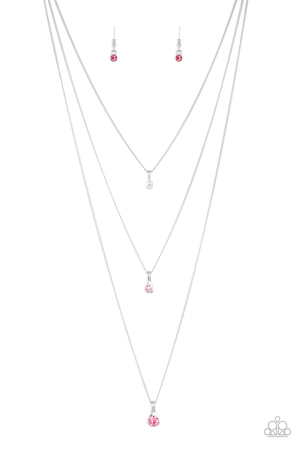 Gradually increasing in size as they drip down the chest, a trio of white, light pink, and pink rhinestone pendants trickle from the bottoms of layered silver chains for a delicate ombre effect. Features an adjustable clasp closure.