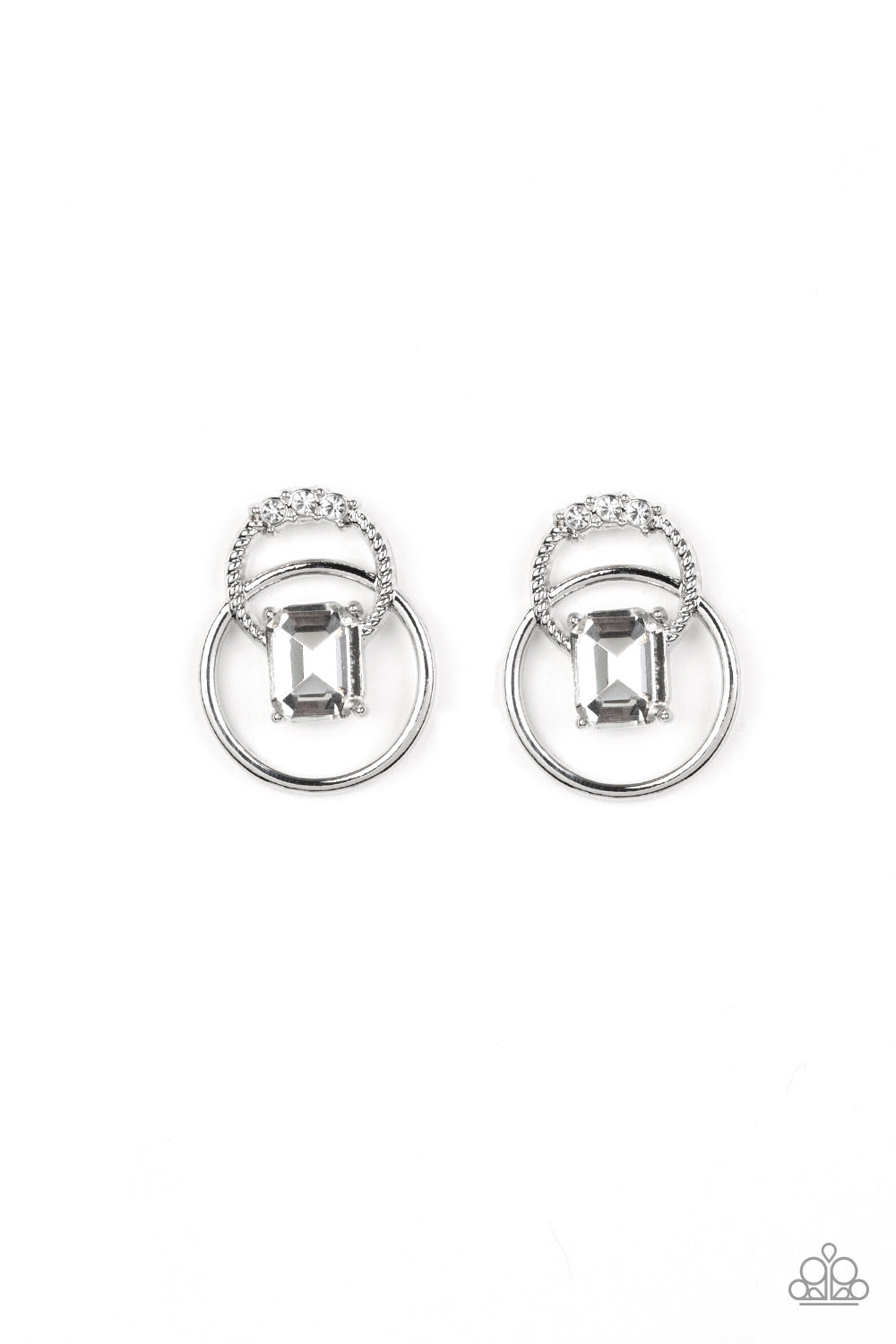 Dotted with glassy white rhinestones, a textured silver hoop connects with a smooth silver hoop. An emerald-cut white rhinestone adorns the center of the airy frame for a refined finish. Earring attaches to a standard post fitting.