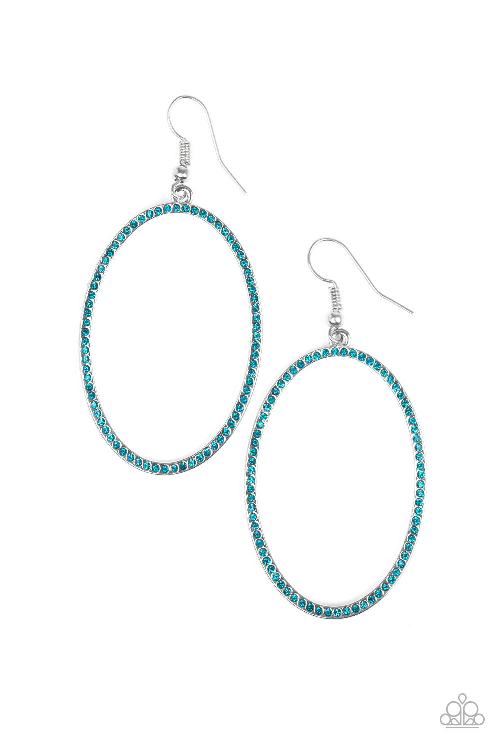 Encrusted in glassy blue rhinestones, an airy silver hoop swings from the ear for a refined fashion. Earring attaches to a standard fishhook fitting.