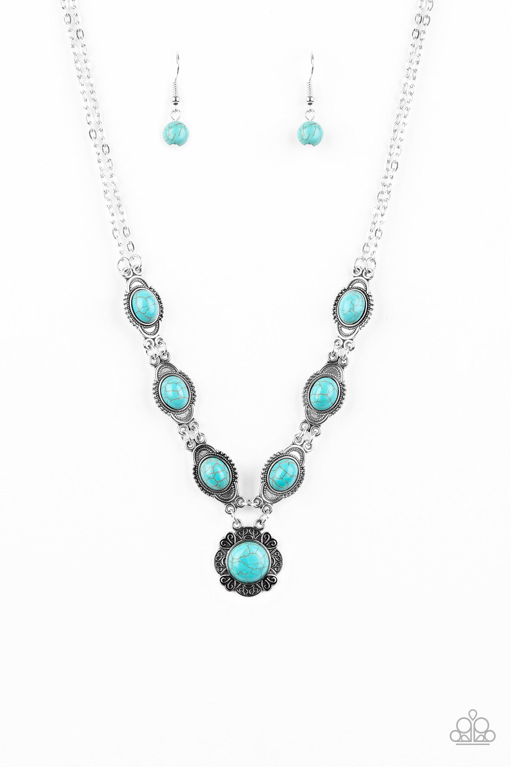 Attached to doubled silver chains, refreshing turquoise stone frames whimsically link below the collar for a seasonal flair. Embossed in filigree details, an additional stone frame links at the center, creating an extended pendant. Features an adjustable clasp closure.