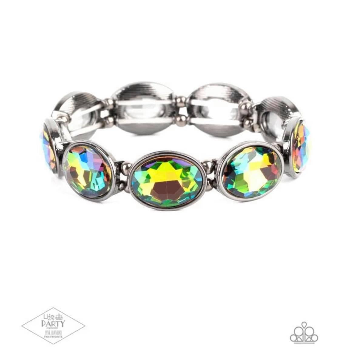 Glittery oil spill gems are pressed into sleek gunmetal frames. Infused with dainty gunmetal beads, the sparkly frames are threaded along stretchy bands for a glamorous look around the wrist.