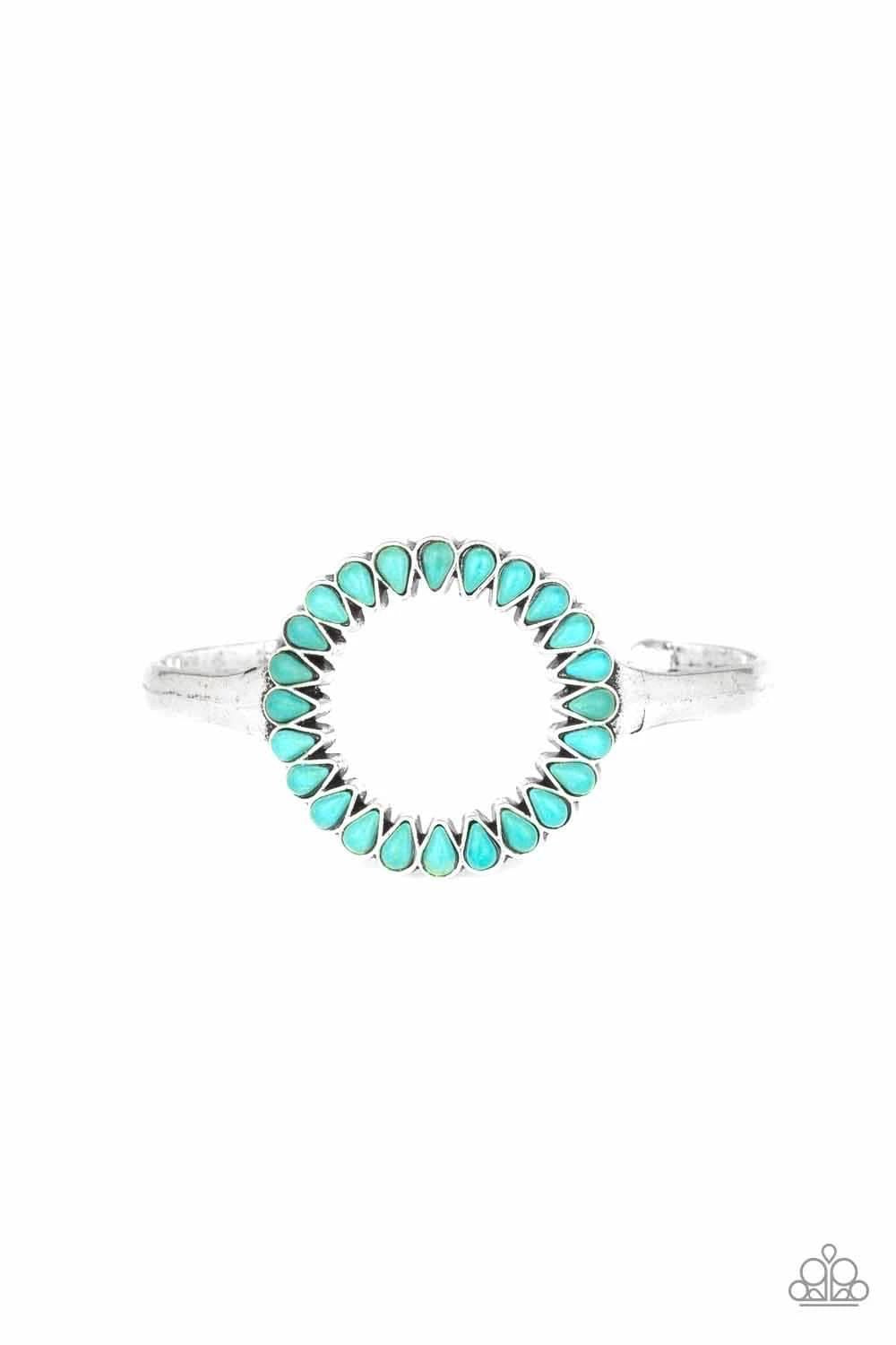 Chiseled into tranquil teardrops, earthy turquoise stones spin around the center of an antiqued silver cuff for a seasonal look.