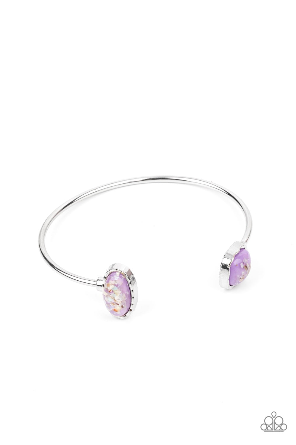 Flecks of iridescent shell-like pieces are encased inside two mismatched glassy purple beads at both ends of a dainty silver open-faced cuff. The shimmery beads are encased in imperfectly hammered silver frames, adding a whimsy finish to the bubbly display.