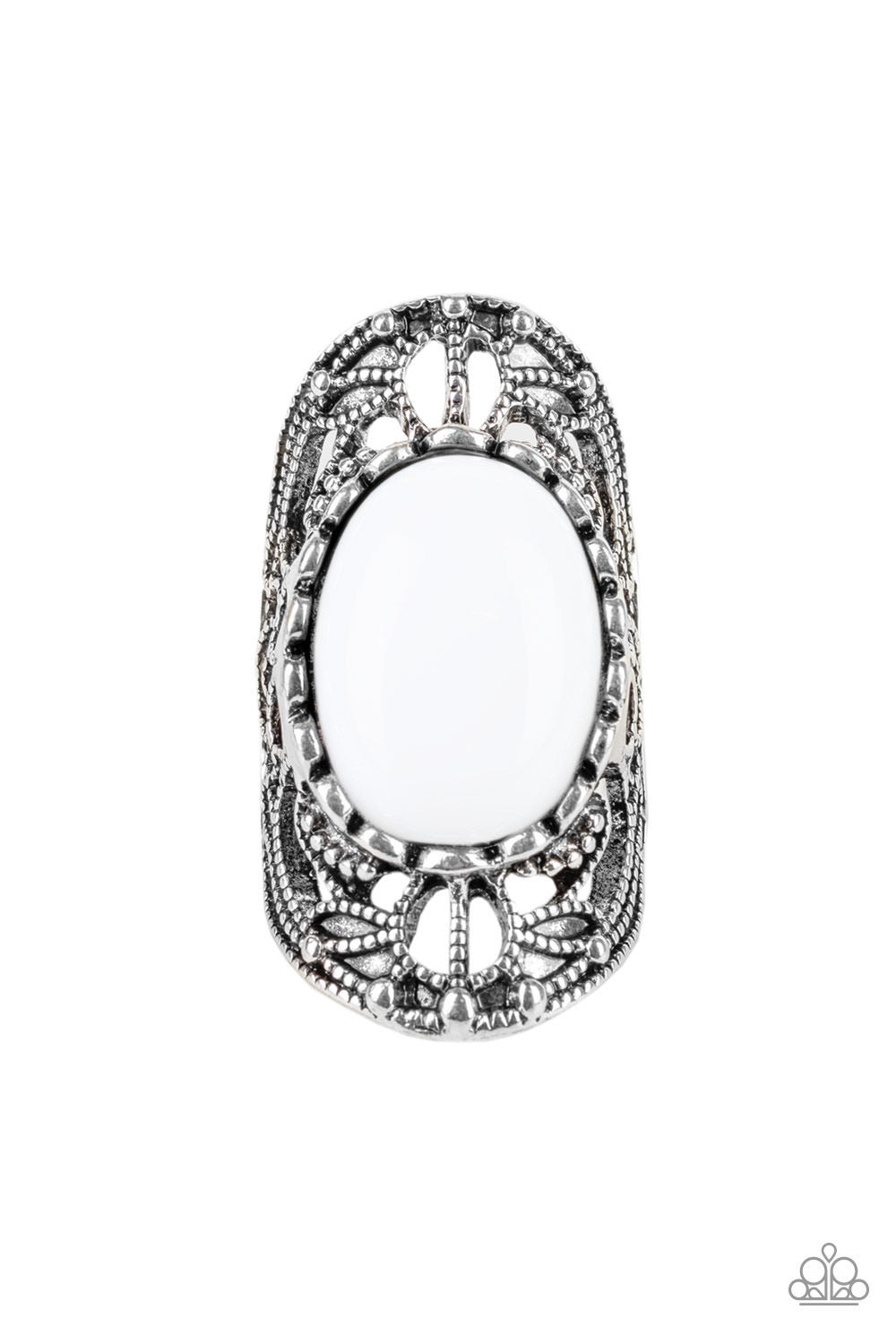 An oversized white bead is pressed into the center of an ornate silver frame studded with whimsical filigree for a dramatic look. Features a stretchy band for a flexible fit.
