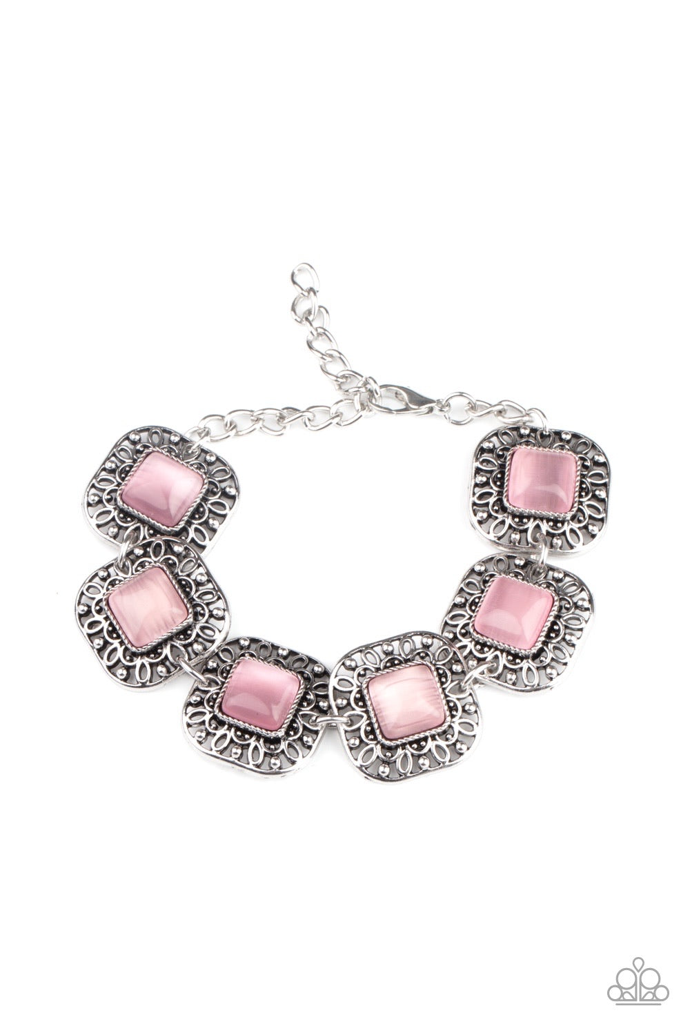 Dotted with pink cat's eye stones, square filigree filled silver frames delicately link around the wrist for a dreamy display. Features an adjustable clasp closure.