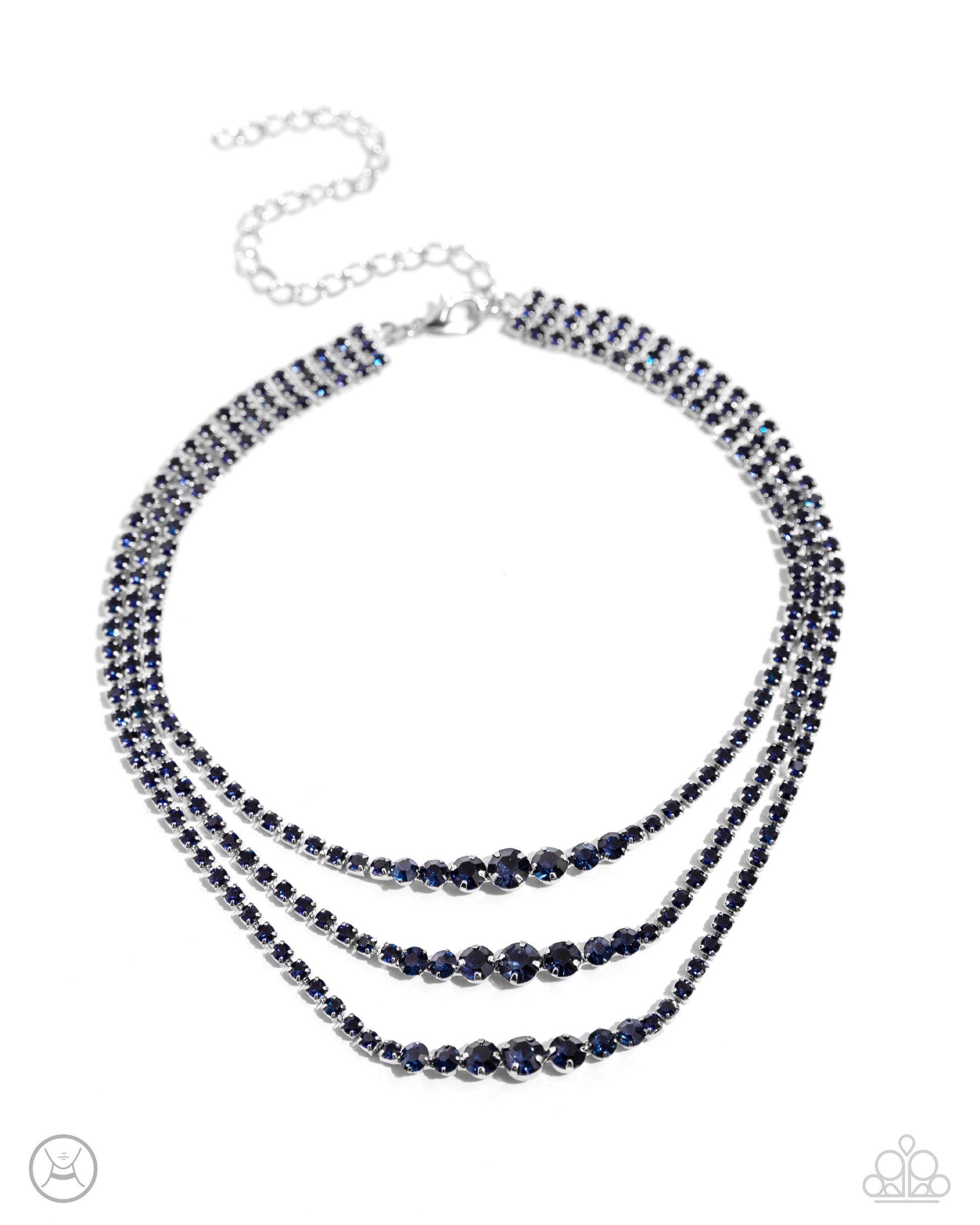 Set in pronged square silver fittings, blue rhinestones gradually increase to larger blue gems in pronged fittings as they cascade down the chest in a trio of layers for a dynamite display. Features an adjustable clasp closure.