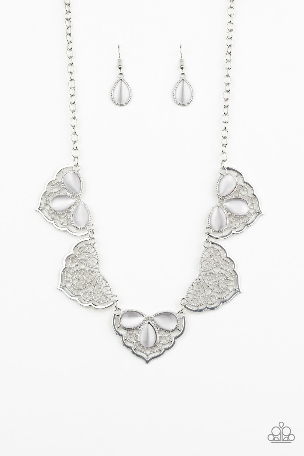 Filled with lacy-like patterns, filigree filled silver frames connect below the collar. Glowing white teardrop moonstones alternate along the airy frames, adding a refreshing hint of color to the whimsical fringe. Features an adjustable clasp closure.