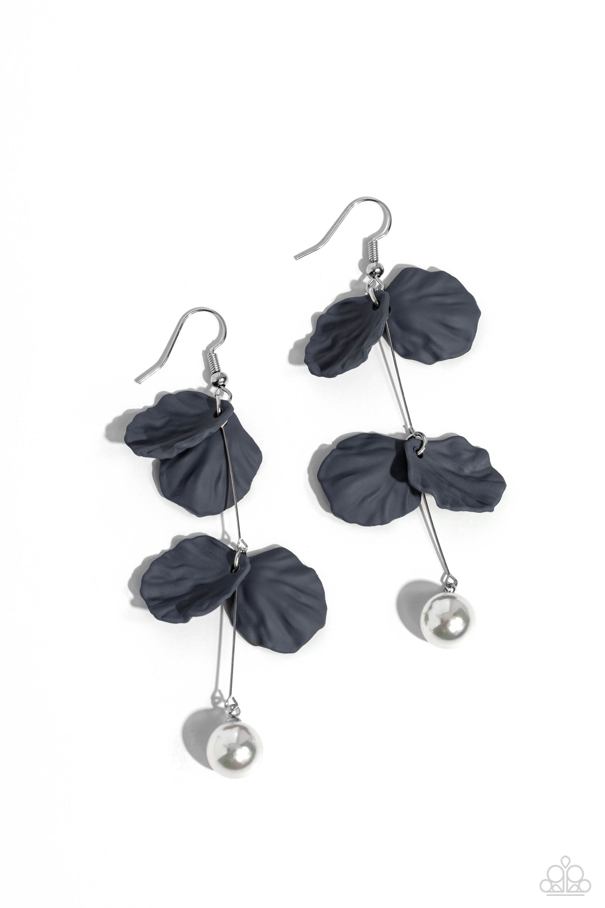 A glossy white pearl delicately links to the bottom of a sleek silver rod. Gray acrylic petals cascade along the silver rod, adding a timeless twist to the classic pearl palette. Earring attaches to a standard fishhook fitting.