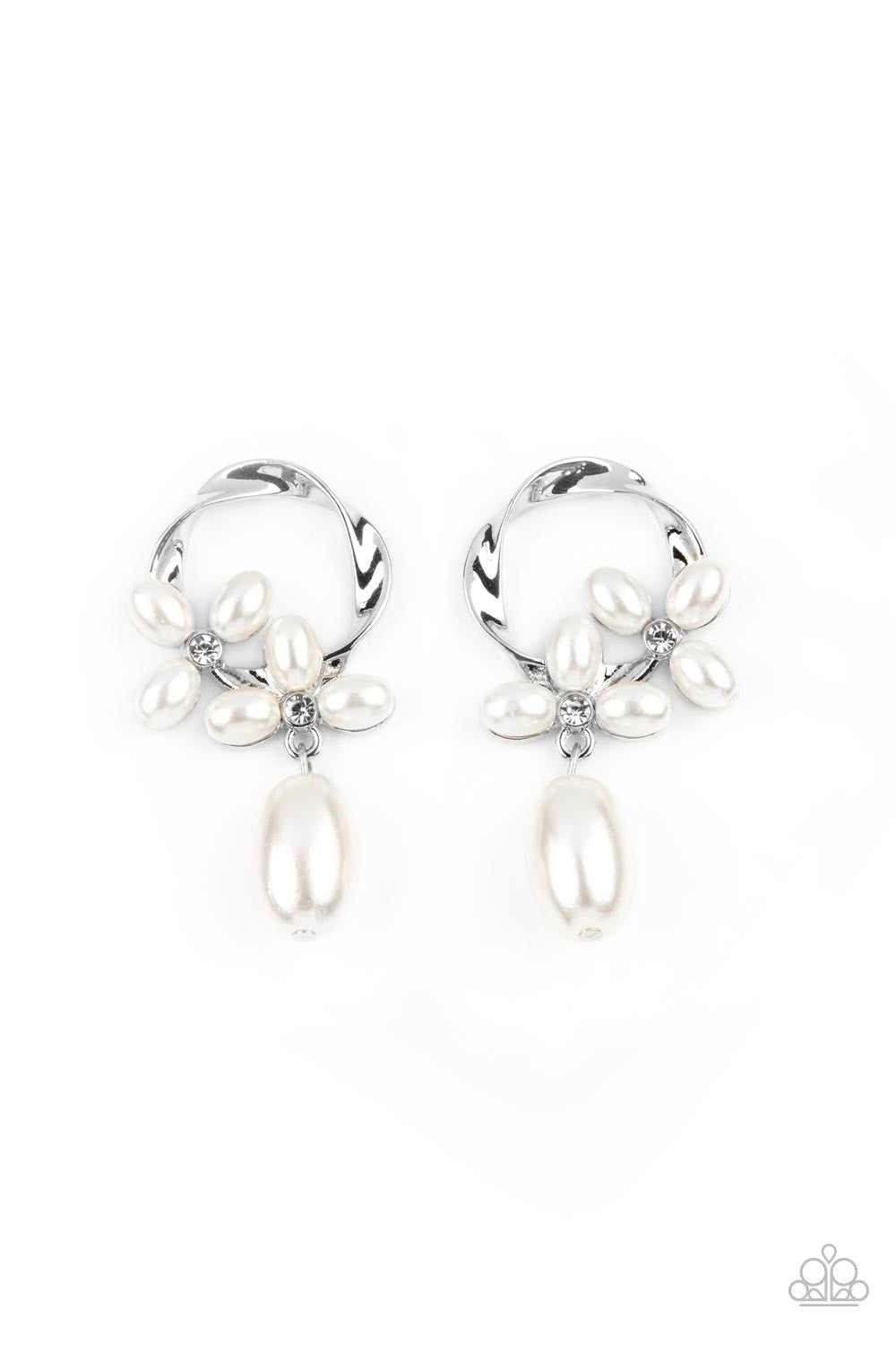 An oversized oval pearl bead swings from the bottom of a twisted silver hoop that is embellished in oval white pearls and dainty white rhinestones, creating a vintage display. Earring attaches to a standard post fitting.