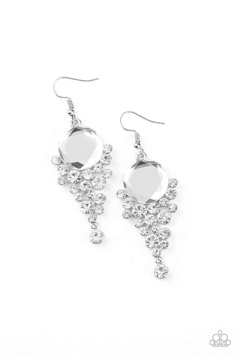 A collection of dainty rhinestones tumble from the bottom of an oversized white gem, coalescing into an effervescent lure. Earring attaches to a standard fishhook fitting.