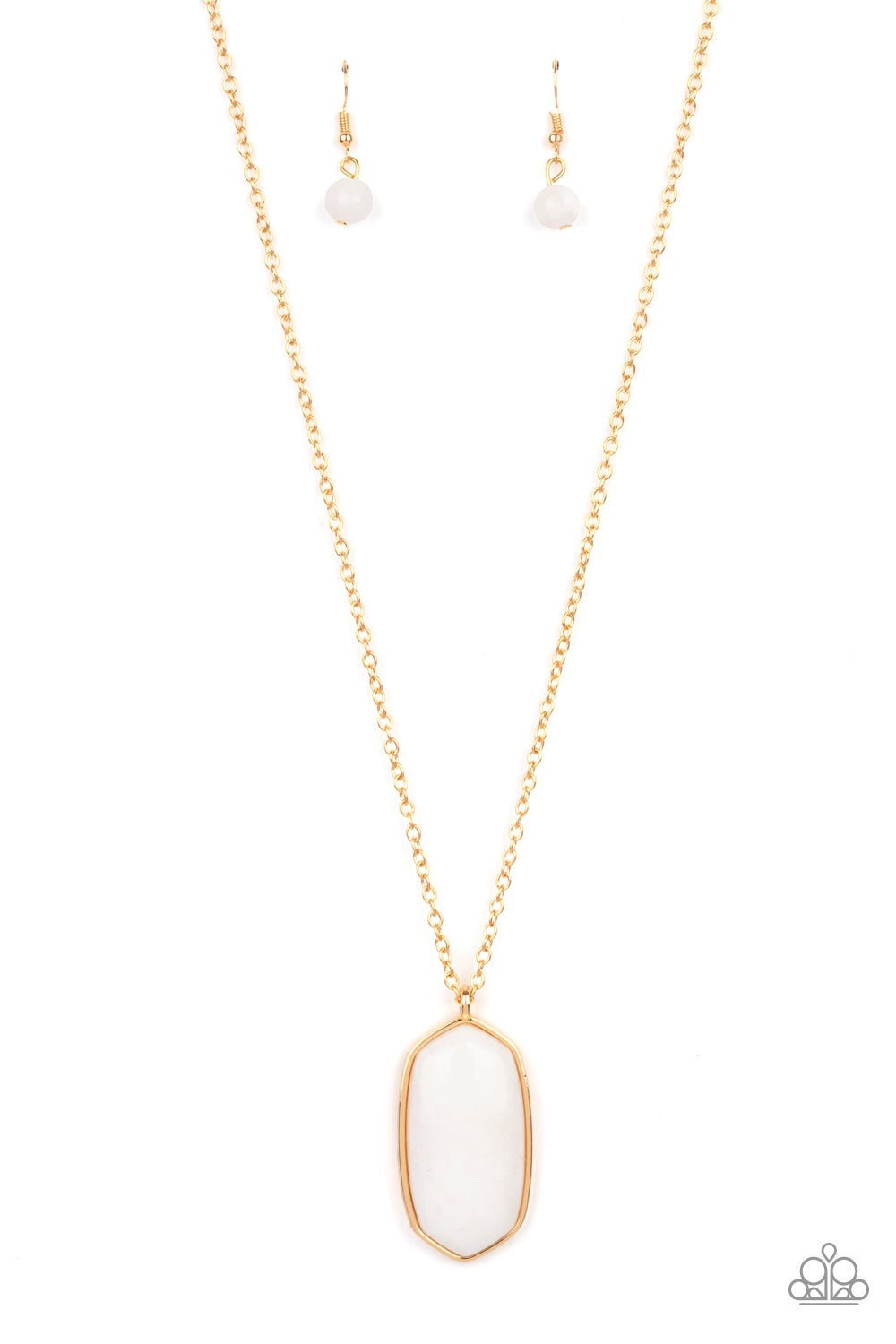Encased in a classic gold fitting, a glassy white stone swings from the bottom of a lengthened gold chain for an elegantly earthy look. Features an adjustable clasp closure.