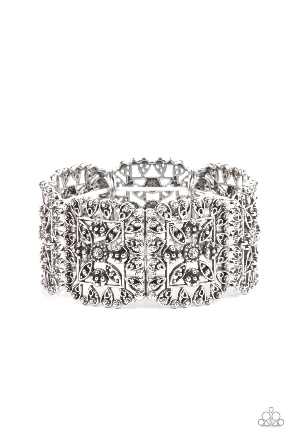 Ornately studded leafy filigree delicately gathers into airy silver square frames that are threaded along stretchy bands around the wrist, creating a vintage inspired look.